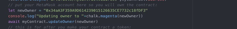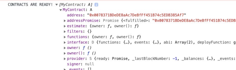 constructor() public { owner = msg.sender; console.log("MyContract is owned by:",owner); } }