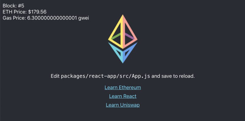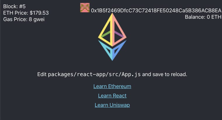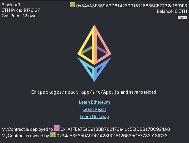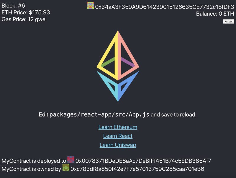 This also brings in the 🦄 Uniswap contracts and gives us some hints on interfacing with the contracts in ⚛️ React.