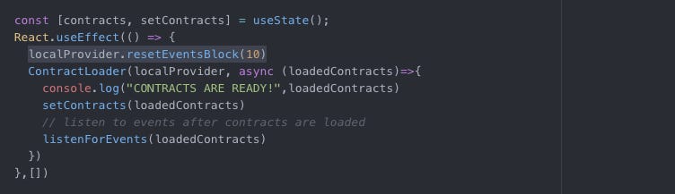 Then, add (uncomment) this from the contract loader so we will start to listen to the events as soon as the contracts are loaded.